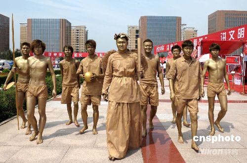 圖:長春青年扮體育雕塑“傳遞”火炬