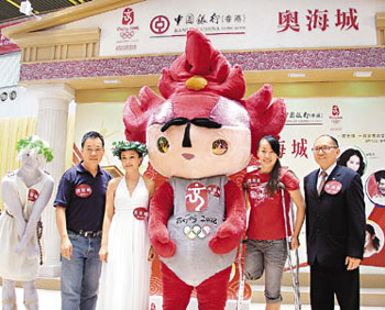 殘疾擊劍運動員金晶(右二)14日抵港,參加在奧海城舉辦的“跳躍體壇夢想”奧運主題活動,與主辦單位負責人及福娃合影。(圖片來源:文匯報)