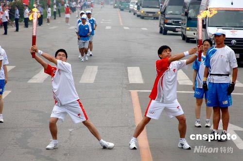 7月15日,奧運(yùn)火炬在吉林松原傳遞;鹁媸智f日(右)、張世民以優(yōu)美姿態(tài)交接火炬。中新社發(fā) 廖攀 攝