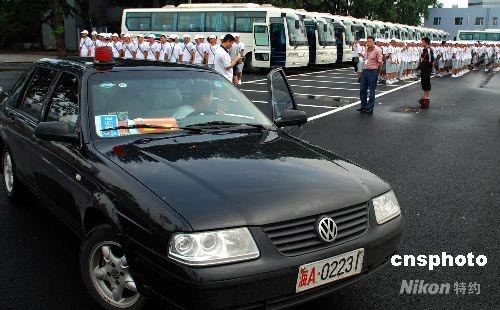 7月15日早上,除一輛懸掛海軍牌照的開路轎車外,其它進入鳥巢的車輛均摘掉了車牌。北京奧組委采取嚴(yán)格的保密措施防止開幕式節(jié)目內(nèi)容泄露。中新社發(fā) 楊慧峰 攝