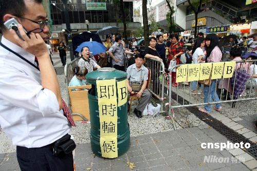 中銀香港發(fā)行奧運紀(jì)念鈔掀起全城狂熱。連日來數(shù)千計市民冒“黃色暴雨”排隊輪候,發(fā)售奧運紀(jì)念鈔票的各分行滿是擁擠的人龍。七月十五日下午,中銀香港尖沙咀分行向通宵排隊的市民作登記。 中新社發(fā) 洪少葵 攝