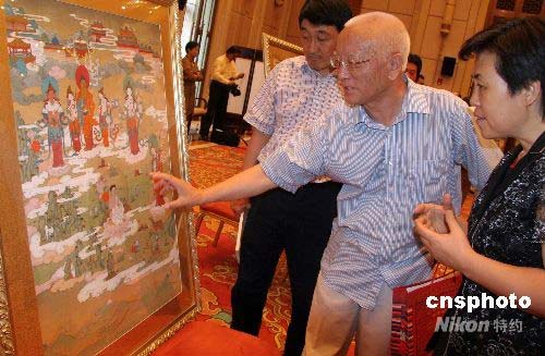 中國社會科學(xué)院《格薩爾》研究中心主任、中國《格薩爾》學(xué)學(xué)會會長降邊嘉措研究員(中)向人們介紹中華民族藏文化藝術(shù)珍品的格薩爾唐卡作品。中新社發(fā) 孫自法 攝