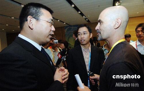7月16日,北京奧組委志愿者部部長劉劍(左)邀請美聯(lián)社記者斯蒂芬來北京作奧運(yùn)志愿者,并邀請他喝北京的豆汁。當(dāng)日,北京奧組委志愿者部相關(guān)官員在北京奧運(yùn)主新聞中心向中外記者介紹奧運(yùn)志愿者籌備的相關(guān)情況。中新社發(fā) 王東明 攝