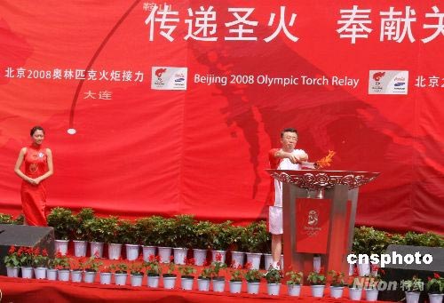 7月17日,最后一棒火炬手、沈陽市委副書記蘇宏章點燃圣火盆,北京奧運火炬圓滿結束了在沈陽的傳遞。 中新社發(fā) 周兆軍 攝