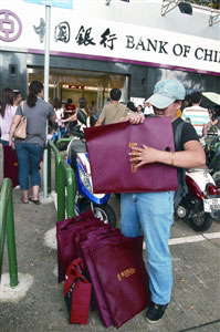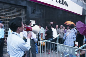 圖:澳門銀行門外有人收集奧運(yùn)鈔。(圖片來源:澳門日報)