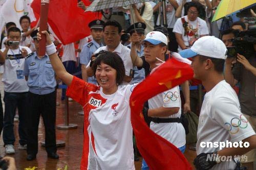 7月19日上午8時,北京奧運(yùn)火炬在大連傳遞,傳遞路線從大連經(jīng)濟(jì)技術(shù)開發(fā)區(qū)發(fā)現(xiàn)王國主題公園開始,到經(jīng)濟(jì)技術(shù)開發(fā)區(qū)中華武館結(jié)束,全長9.41公里。大連市共有火炬手208名,圖為中國第一個歐文斯獎獲得者、奧運(yùn)冠軍王軍霞傳遞第一棒火炬。 中新社發(fā) 宋太盛 攝