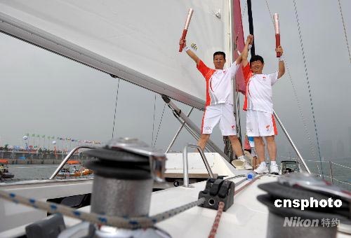 7月21日,奧運火炬在青島號帆船上傳遞。圖為傳遞前兩位火炬手熱情歡呼奧運火炬到來。中新社發(fā) 廖攀 攝