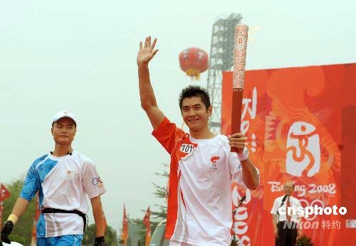 7月22日上午11點(diǎn)30分,隨著首棒火炬手——著名體操運(yùn)動(dòng)員邢傲偉高舉“祥云”火炬在泰安體育中心廣場(chǎng)起跑,北京奧運(yùn)火炬接力泰安站傳遞活動(dòng)正式開(kāi)始。中新社發(fā) 廖攀 攝