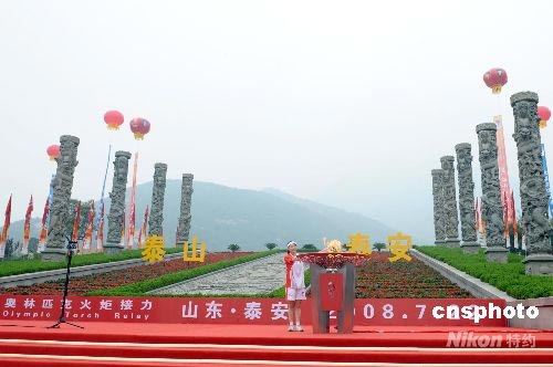 7月22日中午12點42,隨著末棒火炬手畢文靜在泰安天地廣場點燃圣火盆,奧運火炬在泰安的傳遞結(jié)束。泰安是世界聞名的旅游之都,蜚聲中外的五岳之首、有國山之稱的泰山坐落于此。中新社發(fā) 廖攀 攝