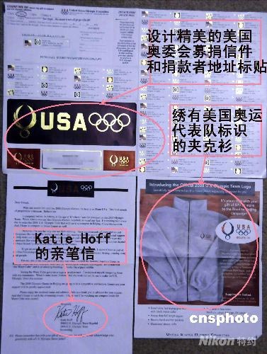 7月22日,記者收到的一封募捐信說:你只需捐20美元,就可以獲得一件如圖所示的繡著美國奧運代表隊標記的運動夾克。更重要的是,這意味著你支持了美國奧運代表隊前往北京參賽的路費。信中還附有美國游泳女一號種子選手霍芙的親筆募捐信。圖為來自美國奧委會的募捐信件內容。 中新社發(fā) 邱江波 攝