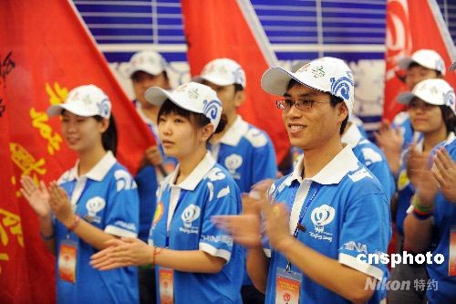 7月24日,北京地鐵社會(huì)志愿者發(fā)出“微笑宣言”服務(wù)奧運(yùn),2萬(wàn)多名來(lái)自地鐵公司和28所高校的地鐵社會(huì)志愿者加入服務(wù)奧運(yùn)活動(dòng)。 中新社發(fā) 陳文 攝