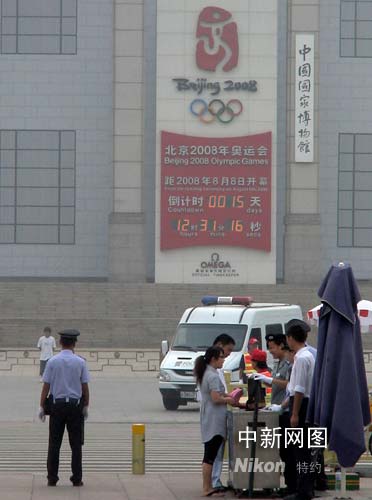 天安門廣場東部的奧運會倒計時牌前保安依然嚴謹。作者:賈國榮