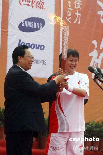 7月25日,原中國女排奧運冠軍、國家體育總局排球運動管理中心書記、副主任張蓉芳作為鄭州奧運火炬?zhèn)鬟f首棒火炬手,從河南省委書記徐光春手中接過奧運火炬。 中新社發(fā) 慎重 攝