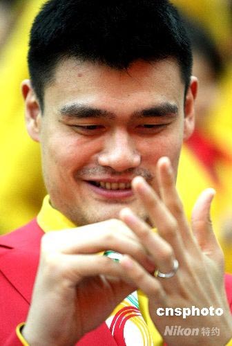 7月25日,參加北京奧運(yùn)會(huì)的中國體育代表團(tuán)在北京正式成立。中國男籃的“擎天柱”姚明為了報(bào)效祖國將暫時(shí)與愛妻葉莉“分居 ”,全力備戰(zhàn)。中新社發(fā) 任晨鳴 攝