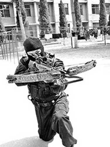 自述:我的外形很傳統(tǒng),乍一看,有些古代暗器的感覺(jué)。但我的威力卻不是其他普通弓箭所能比擬的。有了高科技的幫助,我的射程大大提高!鞍俨酱睢笔枪糯呤值慕^技。但如今,有了紅外線瞄準(zhǔn)器的幫助,任何反恐突擊隊(duì)員在使用我時(shí),都可以百發(fā)百中。而強(qiáng)力弩弓的穿透力甚至能將15厘米厚的樹(shù)木一擊即穿。