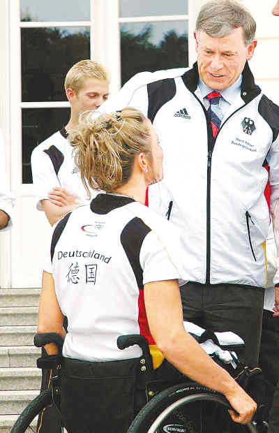 克勒還愉快地接受了在場中國記者的采訪。在談到德國代表團的目標時,克勒說,他不想給運動員增加壓力,重要的是,大家要從比賽中獲得快樂,各國運動員要為世界人民的互相理解做出貢獻。克勒告訴本報記者,他將高興地按原計劃參加北京殘奧會開幕式。