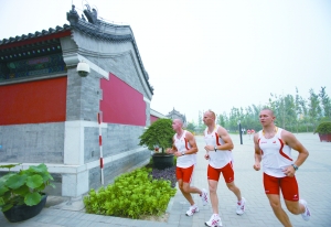 昨日,3名波蘭運(yùn)動(dòng)員在北京奧運(yùn)村內(nèi)跑步。當(dāng)天上午,北京奧運(yùn)村正式開村。