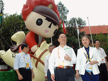 行政長官曾蔭權(quán)與香港奧運村及殘奧村村長梁愛詩巡視香港奧運村的設(shè)施。(圖片來源:香港特區(qū)政府網(wǎng)站)