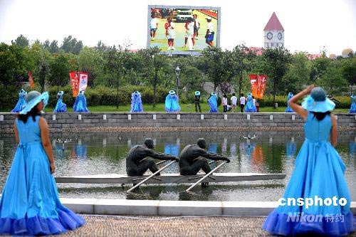 7月30日,奧運火炬在河北秦皇島傳遞,在傳遞終點奧林匹克公園,“海浪姑娘”等待火炬手到來。中新社發(fā) 廖攀 攝