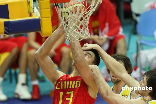 7月30日,國際籃聯(lián)2008鉆石杯男籃比賽第二輪繼續(xù)在江蘇南京進(jìn)行,中國男籃狀態(tài)萎靡,以55比67不敵澳大利亞隊(duì)。姚明本場得14分,但他在進(jìn)攻中卻遭對(duì)手“按頭鎖喉”。中新社發(fā) 盛佳鵬 攝