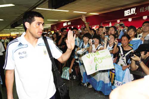 阿根廷國奧隊隊員里克爾梅在機(jī)場受到了熱烈歡迎 陳正寶 攝