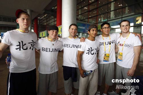 7月31日,美國男子體操隊飛抵北京,在北京首都國際機(jī)場T3航站樓前身著印有“北京”字樣的T恤衫合影。右一為摩根·哈姆,右二為華裔體操選手譚凱文(Kevin Tan)。 中新社發(fā) 杜洋 攝