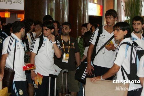 7月31日,阿根廷國(guó)奧隊(duì)抵達(dá)上海,備戰(zhàn)將于8月7日開(kāi)始的北京奧運(yùn)會(huì)足球上海賽區(qū)比賽。作為衛(wèi)冕冠軍,阿根廷隊(duì)將在上海賽區(qū)揭幕戰(zhàn)中對(duì)陣科特迪瓦隊(duì)。圖為阿根廷球員抵達(dá)上海華亭賓館。 中新社發(fā) 湯彥俊 攝