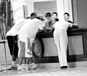 約兩小時(shí)后,4人才離開浴室返回酒店。貴為天王巨星,4人看來比打一場球賽更加疲累,在詢問處查詢時(shí),竟然不顧身份,旁若無人地趴在詢問處柜臺上休息。直至酒店職員安排好,4人才不情愿地站起身返回房間。據(jù)悉,極受球迷歡迎的安東尼離開浴室時(shí),雙手在自己身上做出不雅動作。