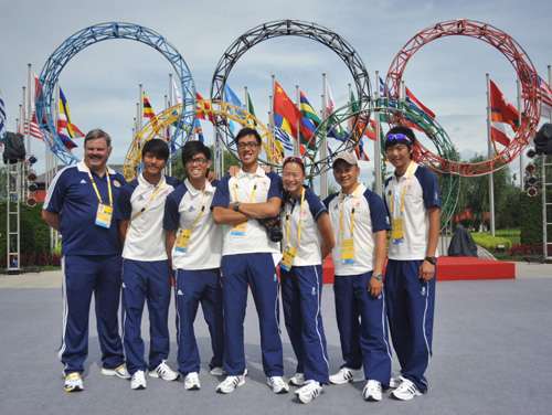 圖:香港單車隊(duì)與賽艇隊(duì)成員在奧運(yùn)五環(huán)前合照(大公報攝)