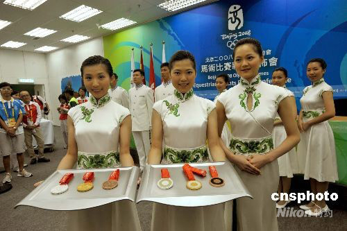 八月二日,擔(dān)任奧運馬術(shù)的禮儀小姐及升旗手,在香港沙田奧運馬術(shù)比賽場地的媒體中心首度會見媒體,并展示奧運馬術(shù)賽事的獎牌。 中新社發(fā) 鄧慶樂 攝