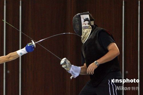 8月3日,兩名運(yùn)動員在北京國際會議中心擊劍館進(jìn)行賽前訓(xùn)練,備戰(zhàn)即將揭幕的北京奧運(yùn)。 中新社發(fā) 武仲林 攝