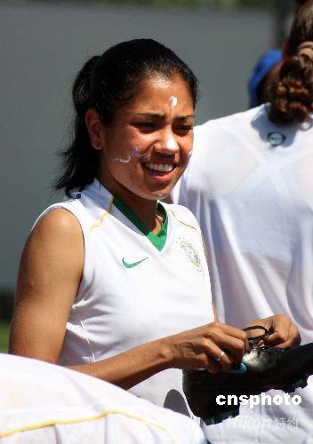 8月3日,巴西女足隊(duì)員在沈陽(yáng)奧體中心訓(xùn)練場(chǎng)進(jìn)行訓(xùn)練,隊(duì)員練前涂抹防曬霜。當(dāng)日,沈陽(yáng)氣溫為31攝氏度,天氣預(yù)報(bào)顯示未來(lái)72小時(shí)沈陽(yáng)都將是32~22攝氏度、風(fēng)力小于3級(jí)的晴好天氣。中新社發(fā) 張宇 攝