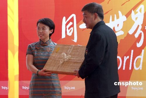 圖為菲律賓奧運代表團團長Julian Camacho和北京奧運村值班村長程紅(左)交換禮品。