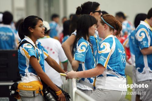 8月4日,幾名外國志愿者在北京奧運(yùn)會(huì)自行車賽場內(nèi)。從昨日起,200多名“百里挑一”的外籍志愿者經(jīng)過最后的培訓(xùn)后,開始在奧體中心場館群、奧運(yùn)村、主新聞中心等地參加志愿服務(wù),成為北京奧運(yùn)會(huì)數(shù)十萬名賽場志愿者中一道亮麗的風(fēng)景線。 中新社發(fā) 武仲林 攝