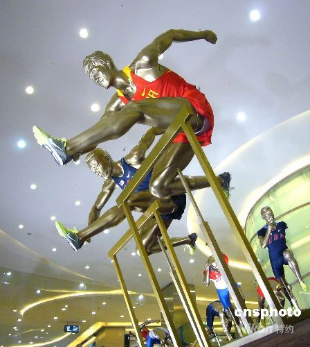 8月4日,隨著北京奧運的臨近,王府井東方新天地開始展示各類體育運動的人物形象,其中“劉翔跨欄”的瞬間成為商場內(nèi)最引人注目的焦點。中新社發(fā) 玉龍 攝