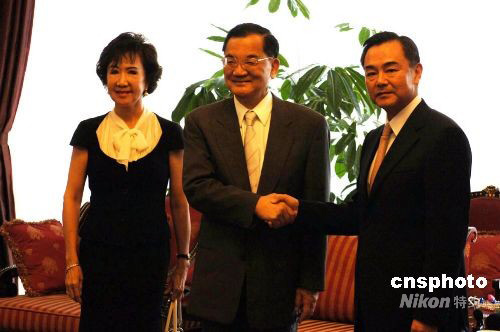 8月5日下午,中國國民黨榮譽主席連戰(zhàn)夫婦一行抵達(dá)北京首都機(jī)場,將觀禮北京奧運開幕式。圖為中共中央臺辦主任王毅在機(jī)場貴賓室會見連戰(zhàn)夫婦一行。中新社發(fā) 王東明 攝