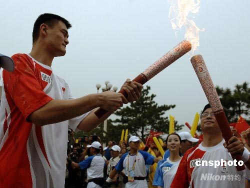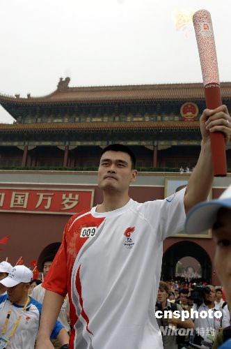 8月6日上午,奧運火炬北京站傳遞從午門正式開始。圖為姚明與白巖松交接火炬。 中新社發(fā) 王東明 攝