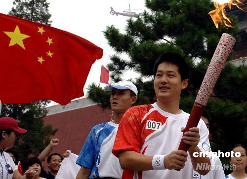 8月6日上午,奧運火炬北京站從午門開始傳遞。圖為圍棋世界冠軍常昊擔任第7棒火炬手傳遞奧運火炬。中新社發(fā) 王東明 攝