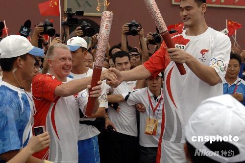圖為國際奧委會協(xié)調(diào)委員會主席維爾布魯根與姚明交接火炬。 中新社發(fā) 王東明 攝
