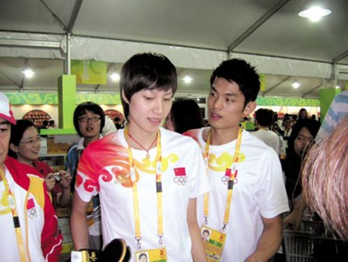 出門(mén),兩人立刻就被“可口可樂(lè)交換紀(jì)念章”的店給吸引進(jìn)去了,結(jié)果兩人一人弄了一件免費(fèi)的環(huán)保T恤。一路上,圍觀拍照的人很多,林丹和謝杏芳很大方,不管是合影或者簽名,都來(lái)者不拒,而且絕對(duì)掛上微笑?粗鹈蚰信(duì)的領(lǐng)軍人物,在大賽前能有這樣的心情和心態(tài),真的很高興。對(duì)于記者的提問(wèn),林丹也不拒絕,但他說(shuō):“我現(xiàn)在不想說(shuō)比賽的事兒,不過(guò)我的狀態(tài)非常好!弊∵M(jìn)了奧運(yùn)村,林丹說(shuō):“這里環(huán)境非常好,比雅典時(shí)候好。”而謝杏芳微微抱怨,“就是床小了點(diǎn)兒!