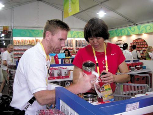 昨晚7點(diǎn)半,采訪完奧運(yùn)村美國(guó)代表團(tuán)的升旗儀式,順路去奧運(yùn)特許商品指定專賣(mài)店看看。一進(jìn)門(mén),就發(fā)現(xiàn)自己來(lái)對(duì)了——林丹、謝杏芳這對(duì)“中國(guó)體壇情侶”正在輕聲細(xì)語(yǔ)地一道逛商店呢。再一看,中國(guó)男排穿著統(tǒng)一的藍(lán)白橫紋T恤,都跟著“老大”周建安在店里轉(zhuǎn)悠。過(guò)了一會(huì)兒,美國(guó)女排教練郎平也來(lái)了……