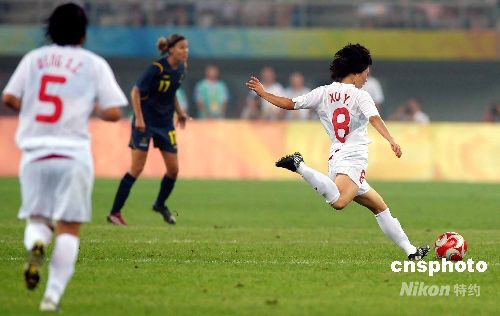 北京奧運(yùn)會(huì)女足小組賽首輪比賽今晚全面打響,中國女足19時(shí)45分在天津奧林匹克球場迎戰(zhàn)瑞典隊(duì)。最終經(jīng)過90分鐘鏖戰(zhàn),中國女足憑借徐媛和韓端的進(jìn)球,以2-1擊敗對手,迎來開門紅。中新社發(fā) 陳文 攝