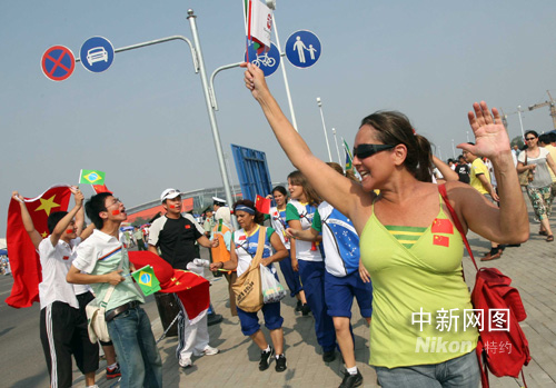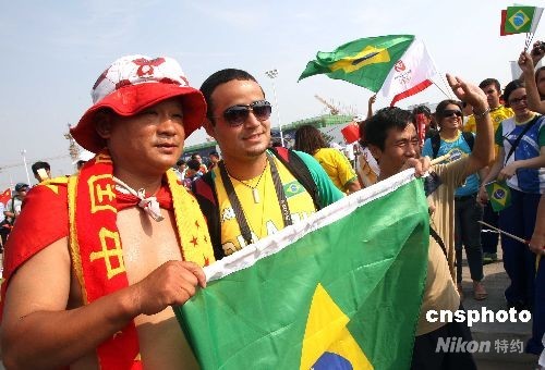 8月7日,巴西、中國球迷在北京奧運沈陽足球分賽場歡呼。當(dāng)晚,男足巴西對比利時、中國對新西蘭將進(jìn)行小組賽。中新社發(fā) 張宇 攝