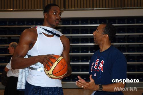 8月7日中午,美國男籃“夢八隊”開始了抵京后的首次訓練。圖為“魔獸”中鋒霍華德與發(fā)球教練進行交流。中新社發(fā) 賴松 攝