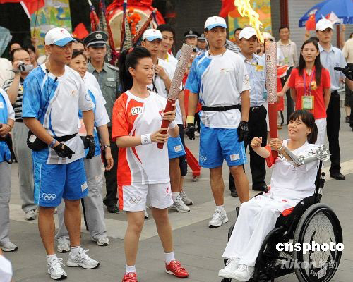 8月7日,奧運圣火繼續(xù)在北京傳遞,桑蘭坐著輪椅用輔助手臂與宋祖英交接火炬。她們是8月7日傳遞的最后兩棒火炬手。 中新社發(fā) 廖攀 攝