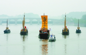 昨日,火炬在京杭大運(yùn)河通州段用仿古船傳遞。本報(bào)記者 浦峰 攝