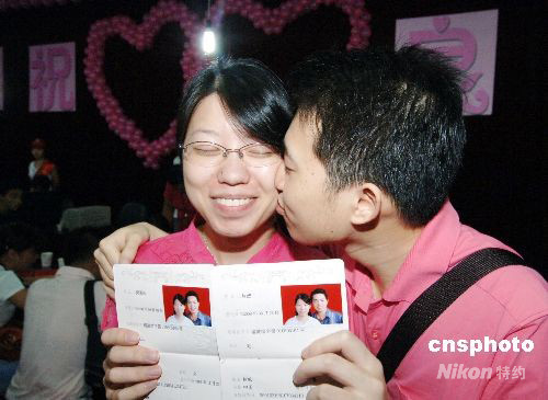 8月8日,北京奧運(yùn)會(huì)開幕日,來自中國(guó)民政部的消息顯示,中國(guó)各地將有數(shù)十萬對(duì)新人喜結(jié)良緣,創(chuàng)下新中國(guó)成立以來日登記量最大的婚姻登記高峰。圖為8月8日早晨8點(diǎn)8分,福州一對(duì)新人領(lǐng)到結(jié)婚證書后深情相吻。中新社發(fā) 劉可耕 攝