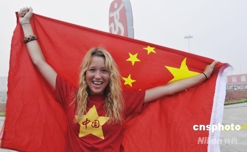 8月8日,澳大利亞女孩“中中”在北京天安門廣場前身披中國國旗,慶賀北京奧運的來臨。中新社發(fā) 王宇婷 攝
