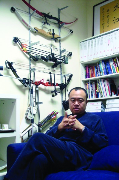 走進(jìn)趙小鈞在上海的辦公室,初看之下,陳設(shè)有些雜亂。電腦桌上方隨意粘貼的,有他不同時(shí)期的照片和肖像漫畫;墻壁上也是滿滿當(dāng)當(dāng),西洋畫挨著中國(guó)書法,弓箭望著書櫥,琳瑯滿目。