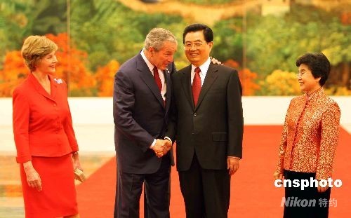 8月8日中午,中國(guó)國(guó)家主席胡錦濤和夫人劉永清在北京人民大會(huì)堂為出席北京奧運(yùn)會(huì)的貴賓舉行歡迎宴會(huì)。圖為胡錦濤夫婦歡迎美國(guó)總統(tǒng)布什夫婦。中新社發(fā) 任海霞 攝
